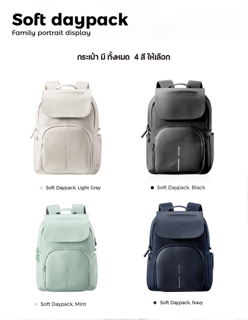 The Soft Daypack กระเป๋าเป้นิรภัยแล็ปท็อป ใช้งานได้หลากหลาย พกพาของใช้ได้ง่าย เหมาะทั้งใช้ไปทำงาน เรียนหรือท่องเที่ยว รุ่น Soft Daypack จะเพรียวบาง มีช่องจัดระเบียบสิ่งของให้หยิบใช้ง่าย มั่นใจได้ว่าของมีค่าของคุณจะไม่ถูกโจรกรรมทำให้คุณทำกิจกรรมได้อย่างสบายใจ ทั้งยังผลิตจากวัสดุรีไซเคิลคุณภาพดี และมีความทนทาน ผสมผสานกับการออกแบบที่ทันสมัย จึงเหมาะแก่การใช้ในทุกโอกาส