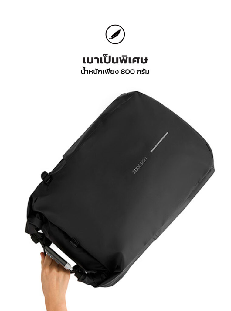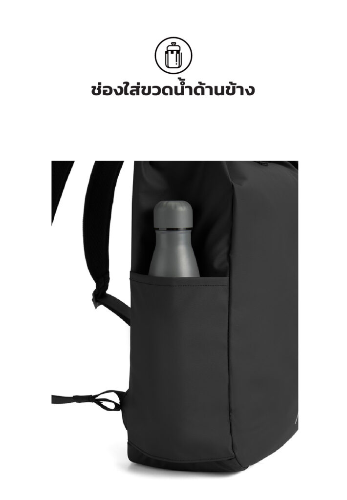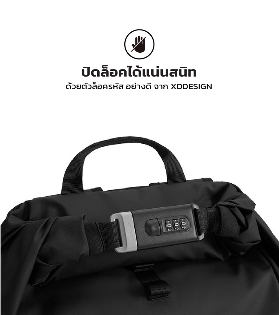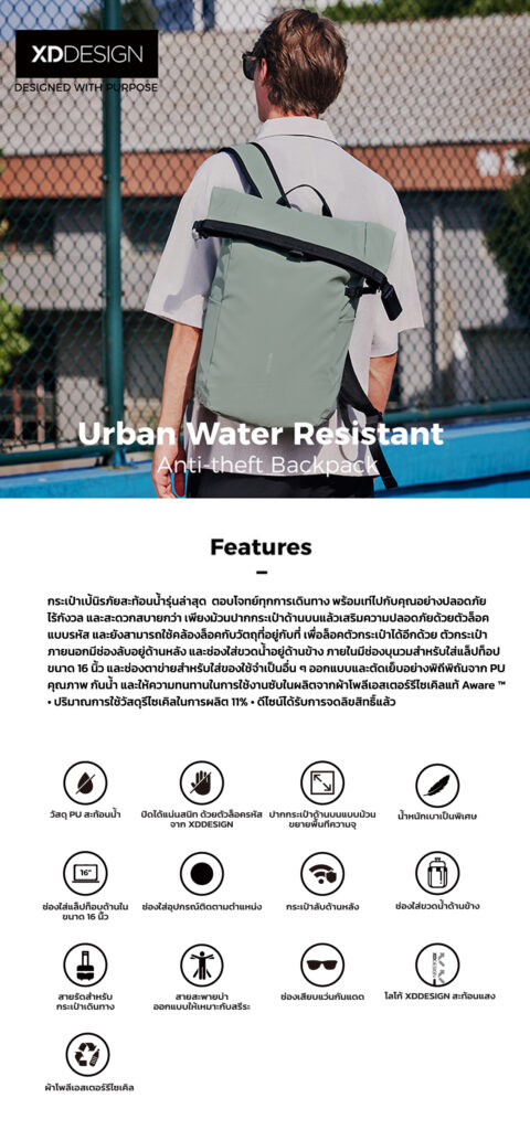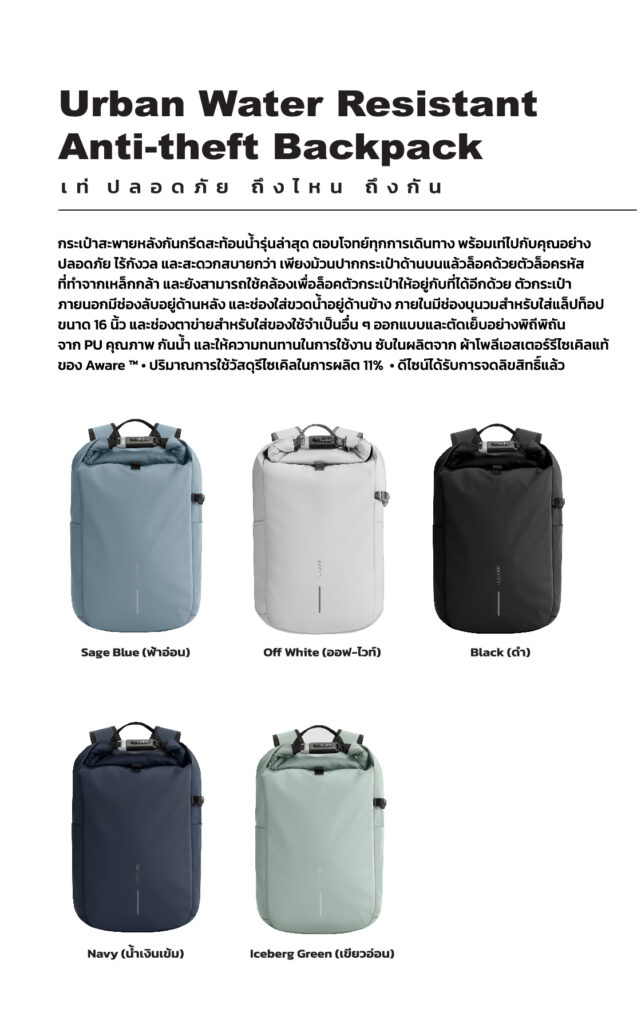 กระเป๋าเป้นิรภัยสะท้อนน้ำรุ่นล่าสุดฺ ตอบโจทย์ทุกการเดินทาง พร้อมเท่ไปกับคุณอย่างปลอดภัย ไร้กังวล และสะดวกสบายกว่า เพียงม้วนปากกระเป๋าด้านบนแล้วเสริมความปลอดภัยด้วยตัวล็อคแบบรหัส และยังสามารถใช้คล้องล็อคกับวัตถุที่อยู่กับที่ เพื่อล็อคตัวกระเป๋าได้อีกด้วย ตัวกระเป๋าภายนอกมีช่องลับอยู่ด้านหลัง และช่องใส่ขวดน้ำอยู่ด้านข้าง ภายในมีช่องบุนวมสำหรับใส่แล็ปท็อปขนาด 16 นิ้ว และช่องตาข่ายสำหรับใส่ของใช้จำเป็นอื่น ๆ ออกแบบและตัดเย็บอย่างพิถีพิถันจาก PU คุณภาพ กันน้ำ และให้ความทนทานในการใช้งาน ซับในผลิตจากผ้าโพลีเอสเตอร์รีไซเคิลแท้ Aware ™